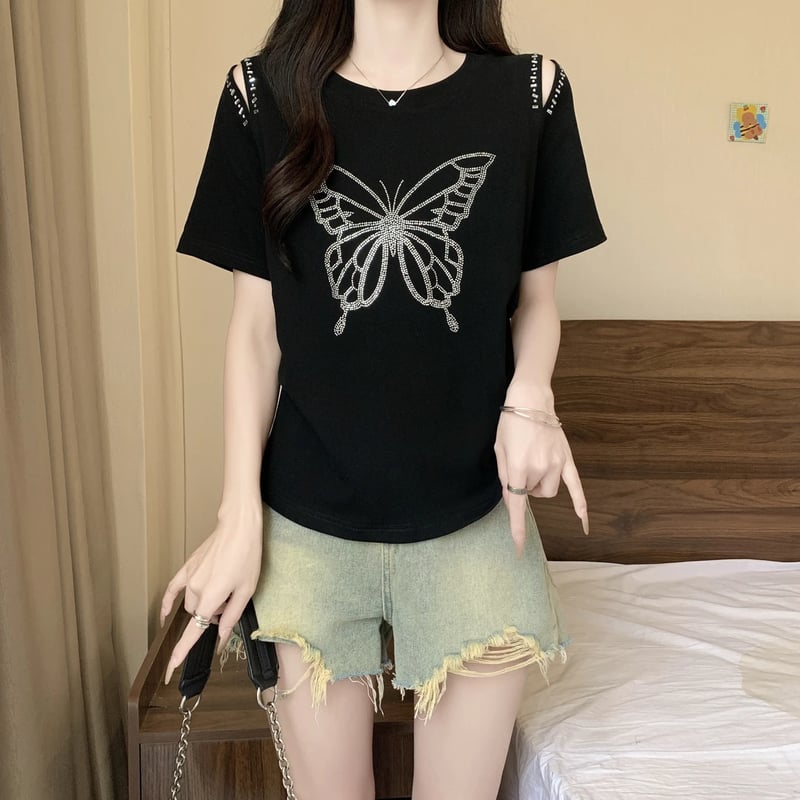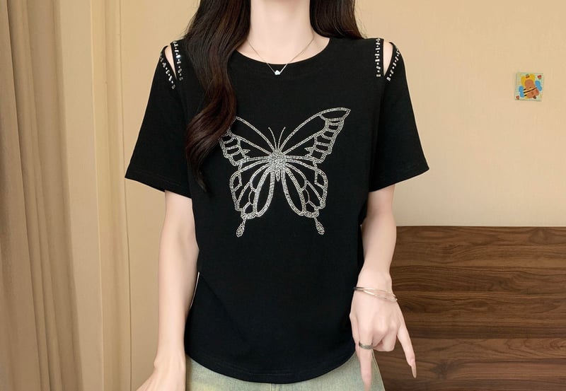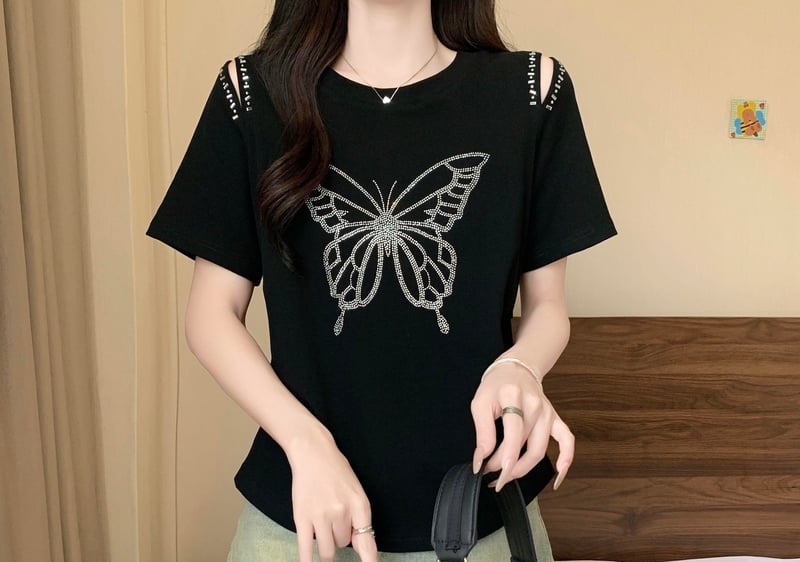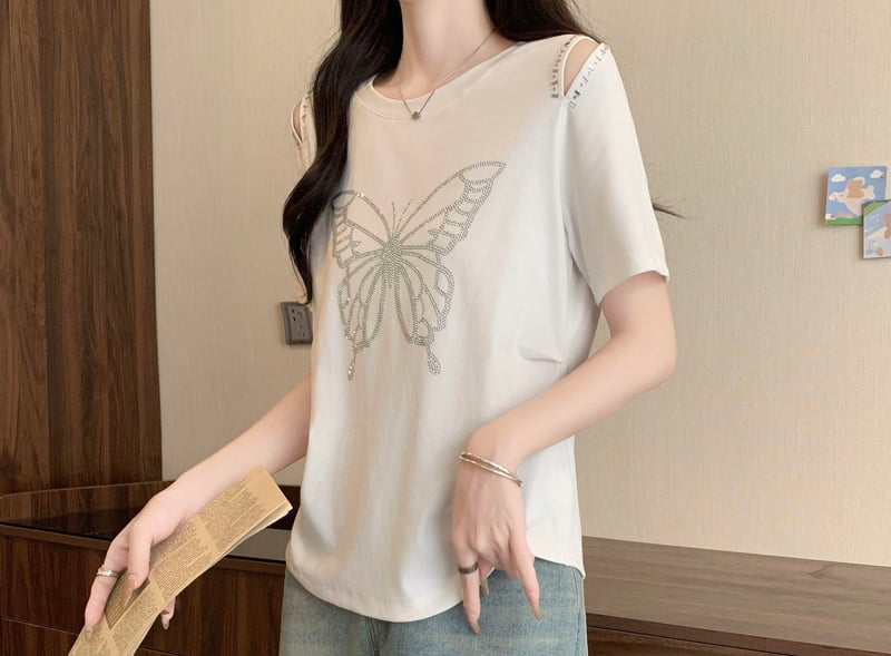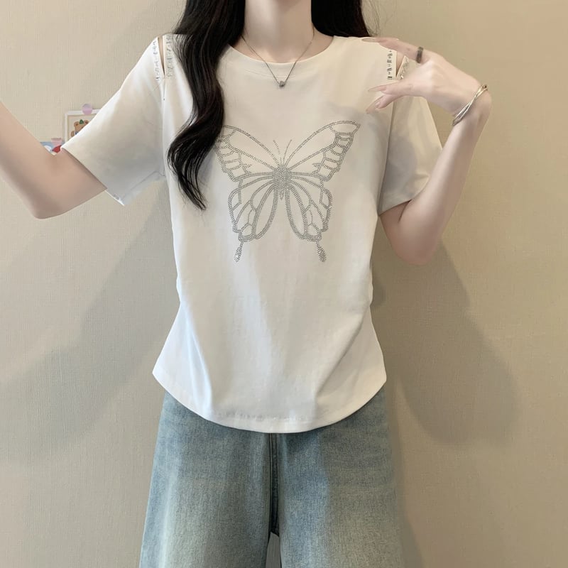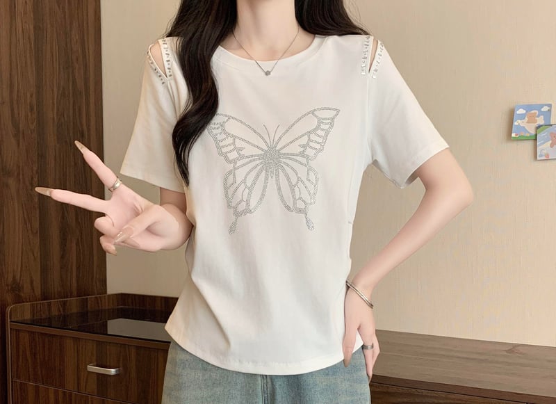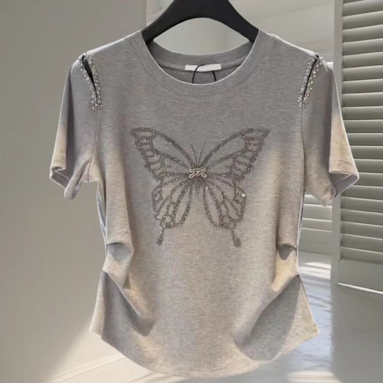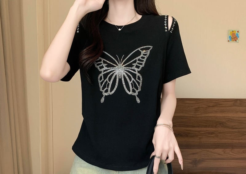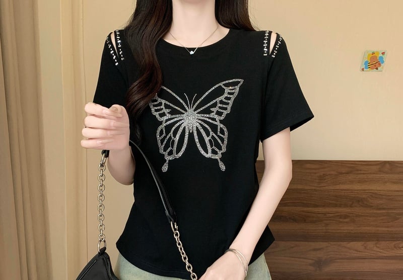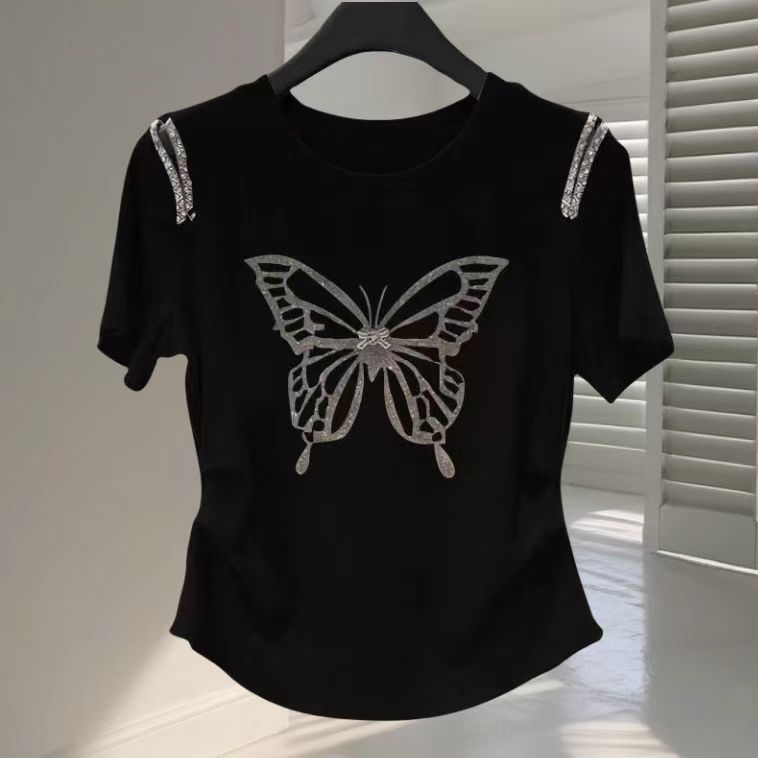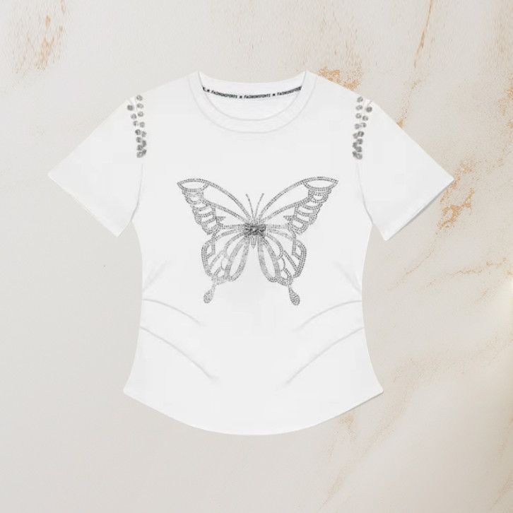 【蝴蝶燙鑽時尚短袖】精緻短袖, 精美蝴蝶燙鑽印花,閃耀時尚,露肩設計,百搭有氣質,褶皺腰線,顯瘦減齡~~