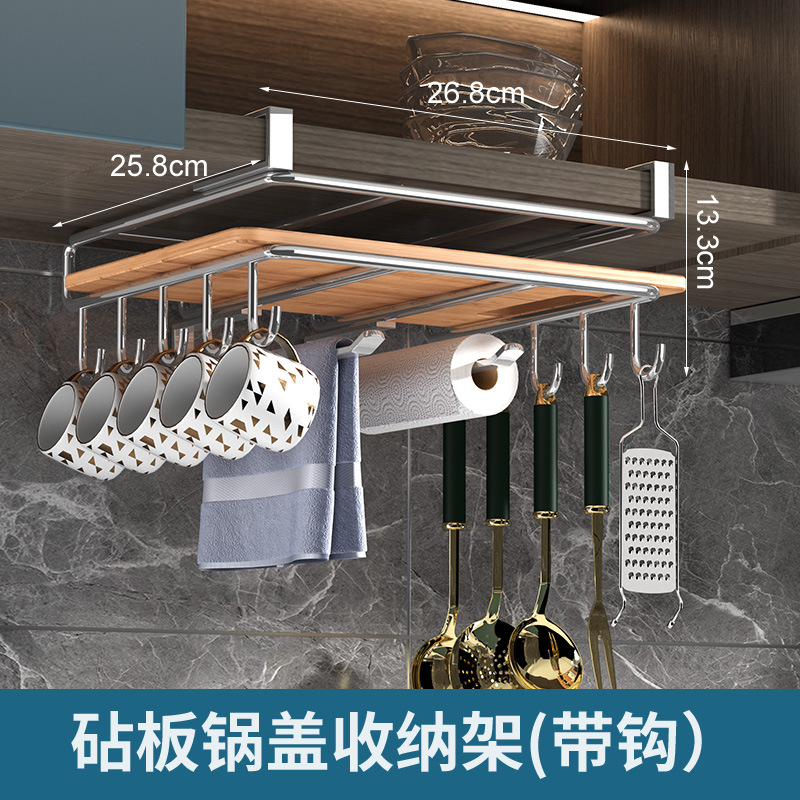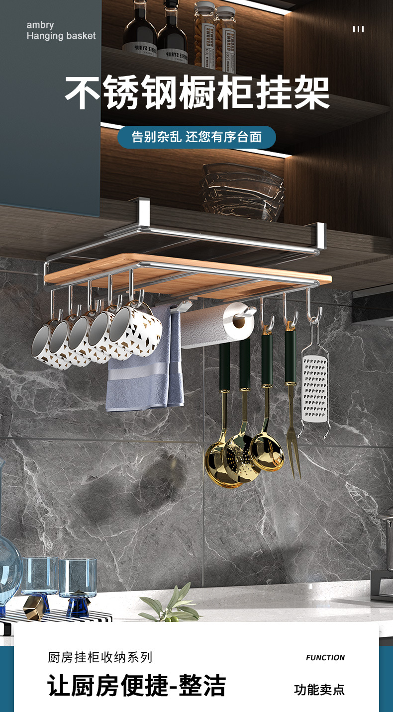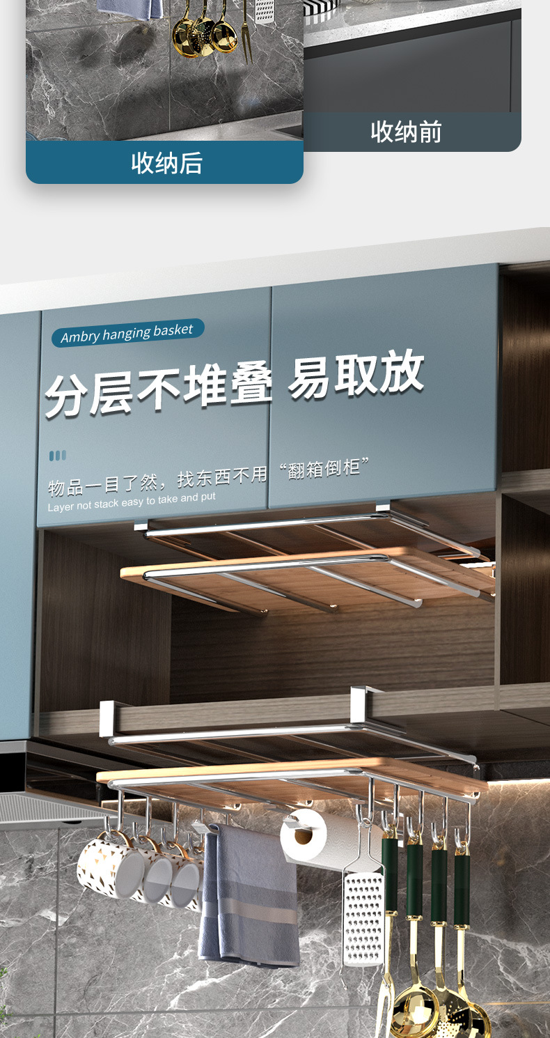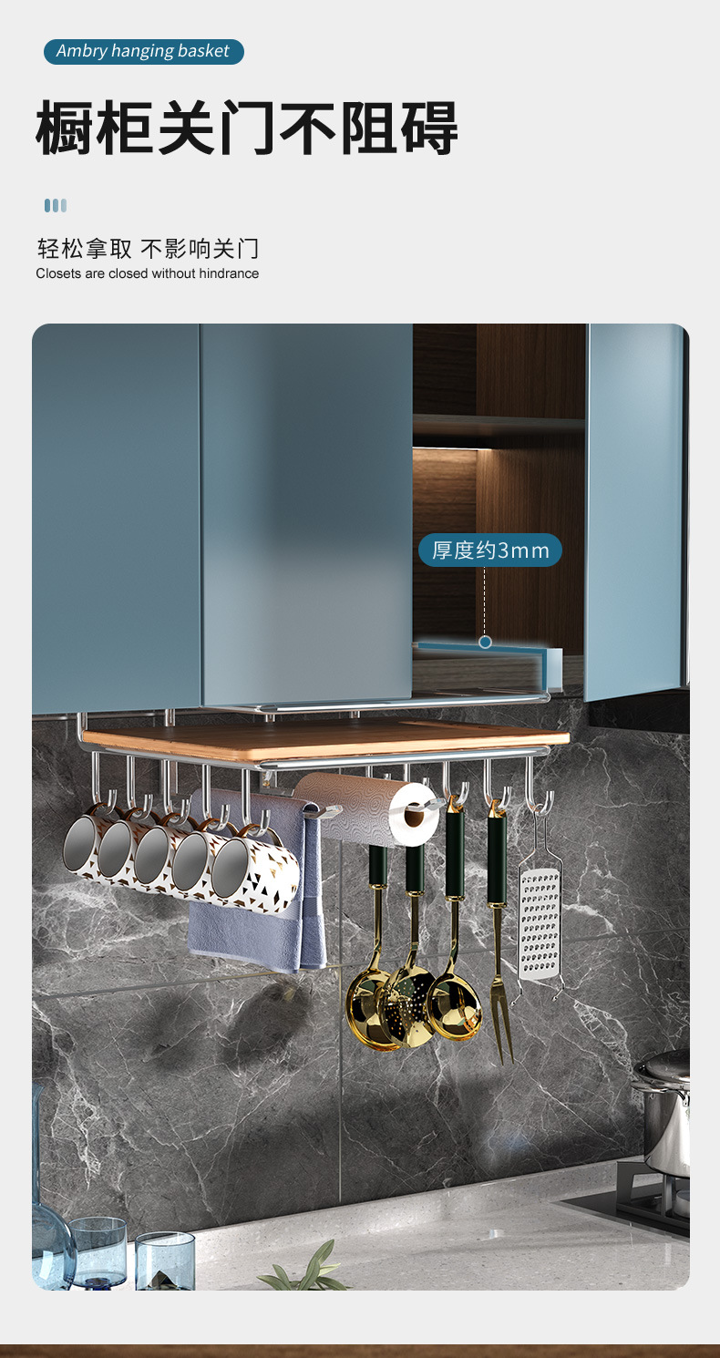 1架N用,超全能 上層穩放菜板/砧板,告別檯面堆積。 下掛鉤隨心掛:杯子、毛巾、鍋鏟、紙巾…廚具「各就各位」。 連保鮮膜、擦絲器都能掛,小物件秒歸位~ 免打孔·穩如泰山; 卡扣式安裝在櫥櫃下,不用鑽牆、不傷櫃體,女生也能3分鐘搞定!承重超穩,掛滿重物也不晃