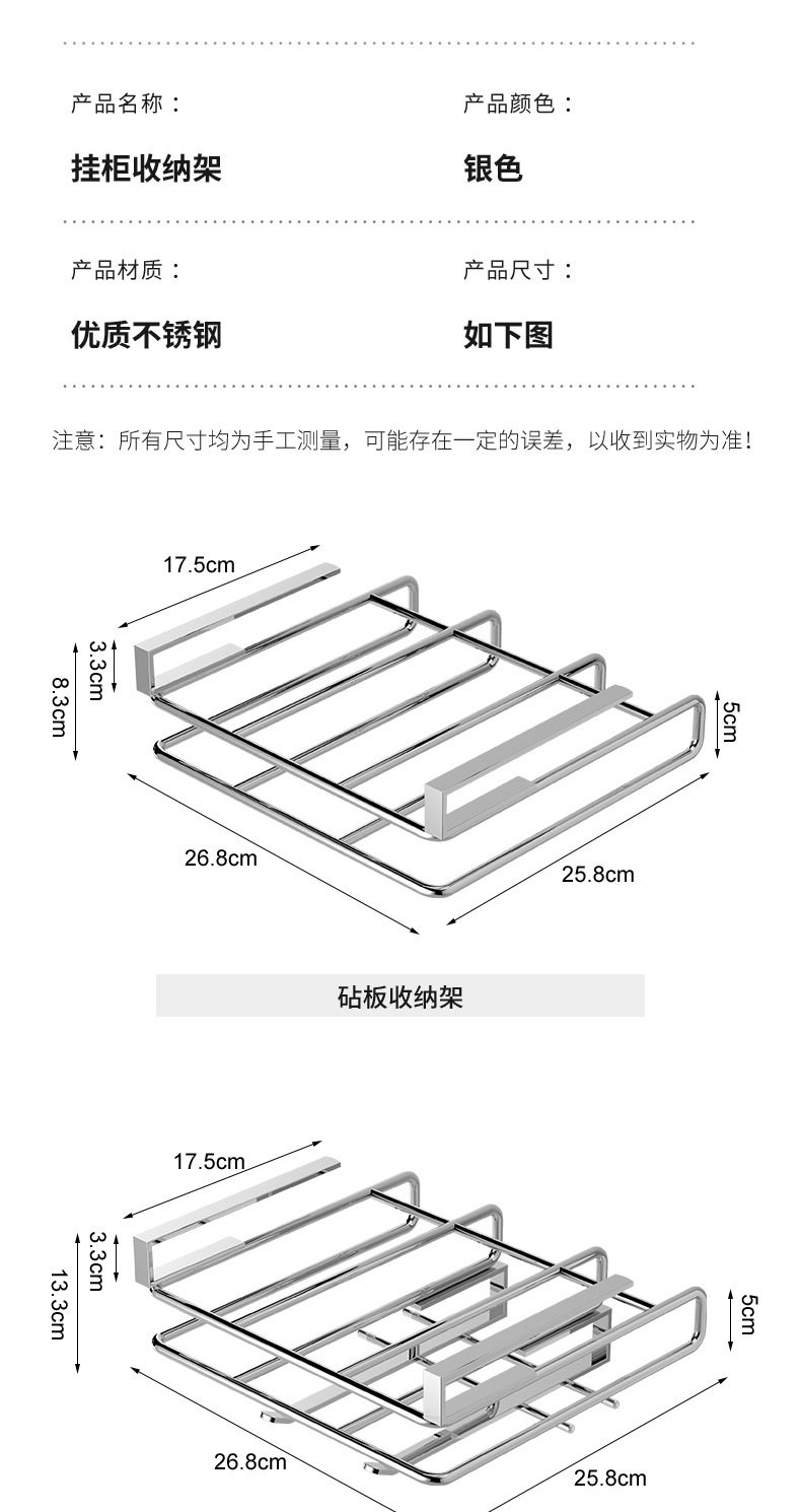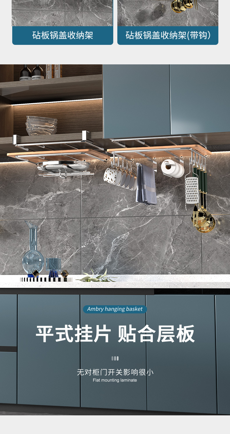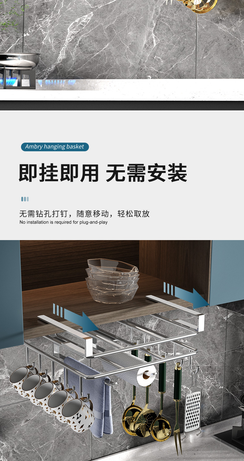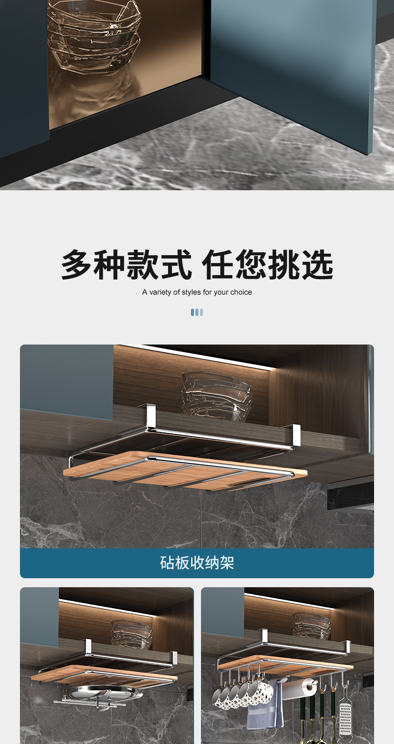 1架N用,超全能 上層穩放菜板/砧板,告別檯面堆積。 下掛鉤隨心掛:杯子、毛巾、鍋鏟、紙巾…廚具「各就各位」。 連保鮮膜、擦絲器都能掛,小物件秒歸位~ 免打孔·穩如泰山; 卡扣式安裝在櫥櫃下,不用鑽牆、不傷櫃體,女生也能3分鐘搞定!承重超穩,掛滿重物也不晃