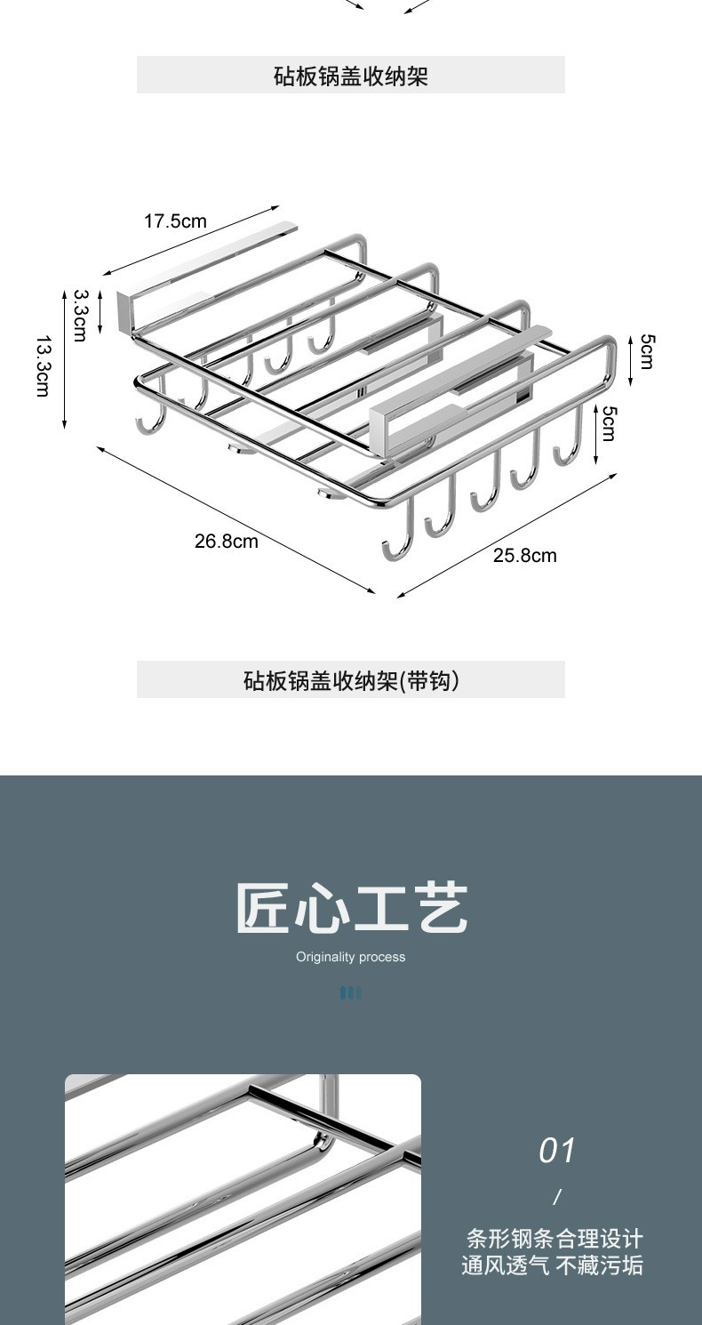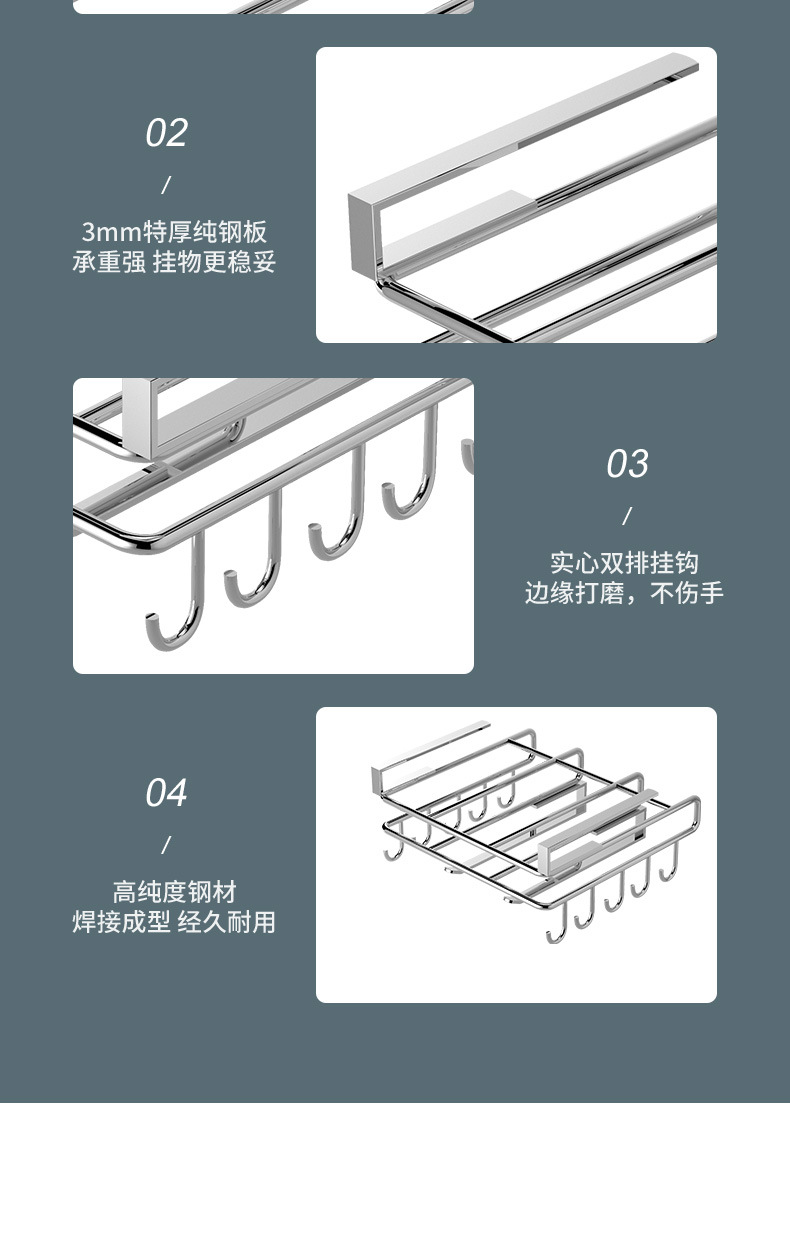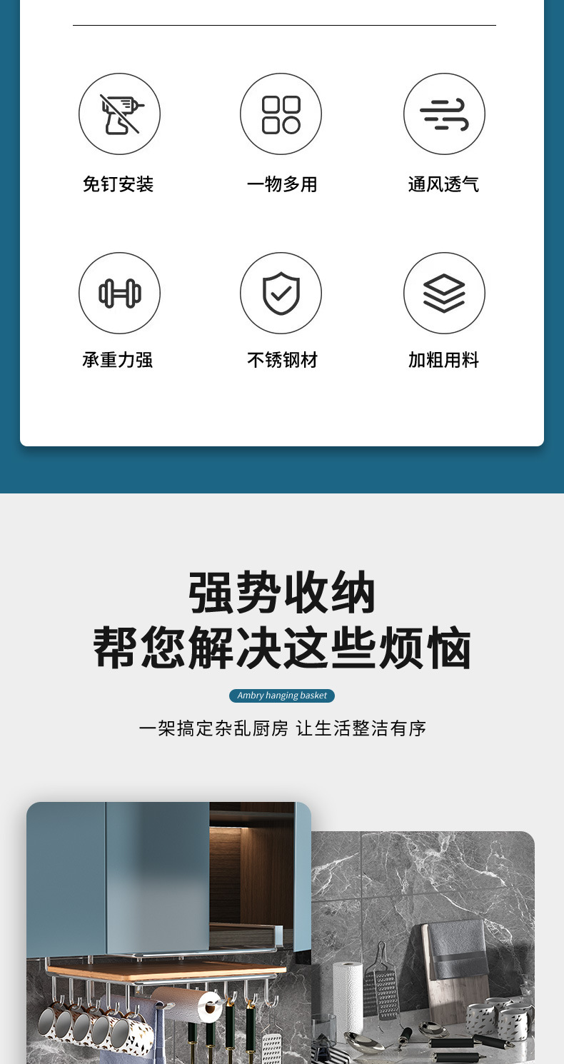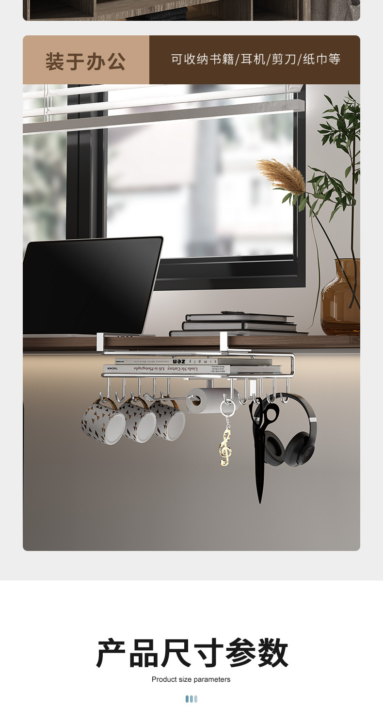1架N用,超全能 上層穩放菜板/砧板,告別檯面堆積。 下掛鉤隨心掛:杯子、毛巾、鍋鏟、紙巾…廚具「各就各位」。 連保鮮膜、擦絲器都能掛,小物件秒歸位~ 免打孔·穩如泰山; 卡扣式安裝在櫥櫃下,不用鑽牆、不傷櫃體,女生也能3分鐘搞定!承重超穩,掛滿重物也不晃