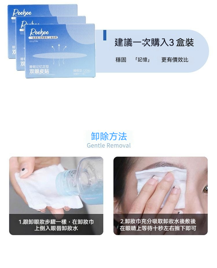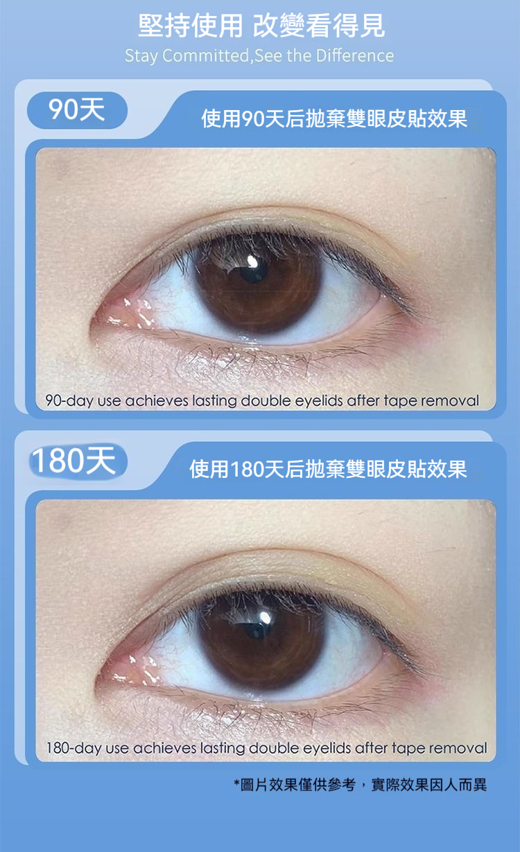 日夜雙重護理:白天貼上自然定型,隱形舒適不突兀;夜晚睡眠時鞏固記憶,堅持使用幫助眼皮形成自然雙眼皮褶皺。