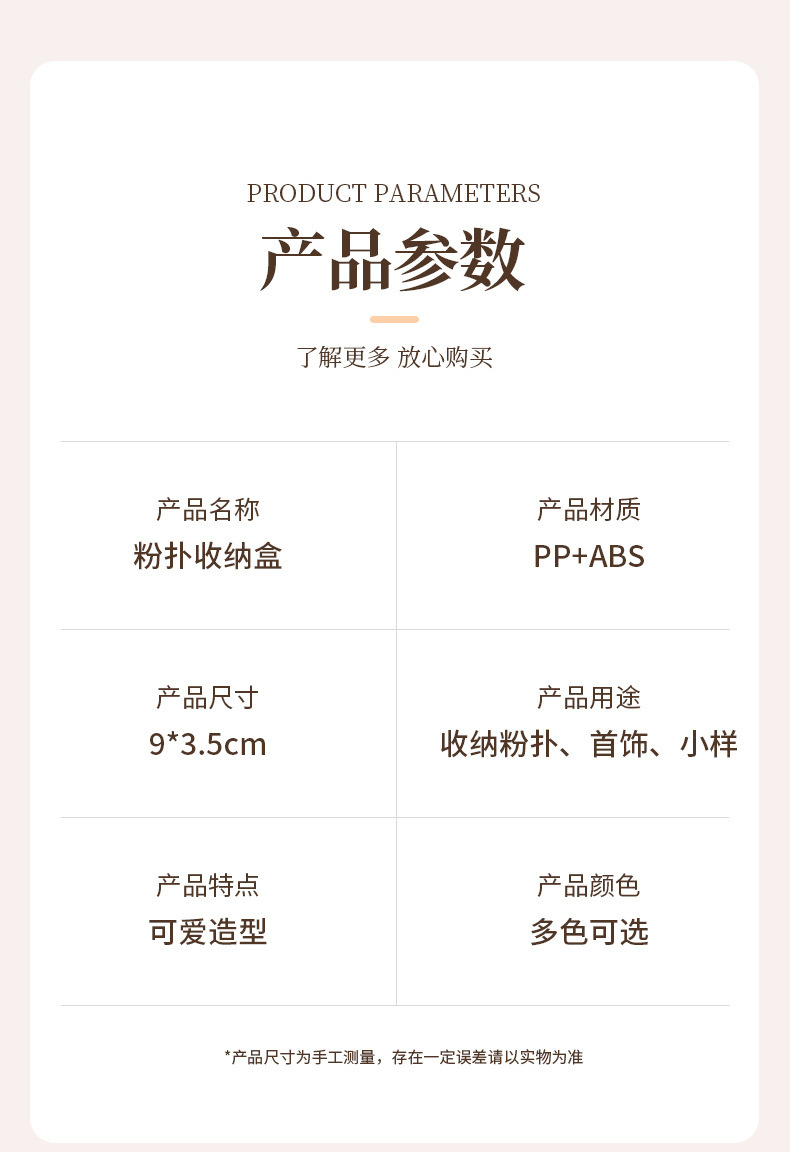 小巧體積+輕量化設計,塞進化妝包、通勤包毫無壓力~出門補妝時,粉撲、鏡子、散粉/氣墊一站式攜帶,再也不用翻包找東西,隨時隨地地get精緻妝容~